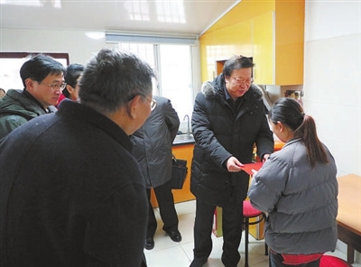 | 李晓钟(右二)慰问困难职工王喜爱,向她送上慰问金。 见习记者邹伟锋 摄 |
