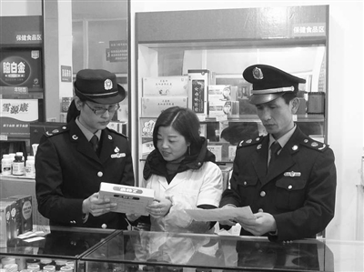 日前,湖州市长兴县市场监管局组织开展了保健食品专项执法检查,执法人员深入各个药店、保健食品专卖店、大中型商场超市专柜等,主要查看保健食品经营单位的相关经营资质,购入保健食品的供货商资质、票据、检验报告以及从业人员相关档案,并对店内张贴的保健食品广告是否涉及夸大宣传、是否宣传有治疗效果以及是否存在虚假宣传和欺诈等违法违规行为进行核实检查指导。图为该局执法人员在当地和平镇一家药店内对保健食品的票据进行核对检查。
