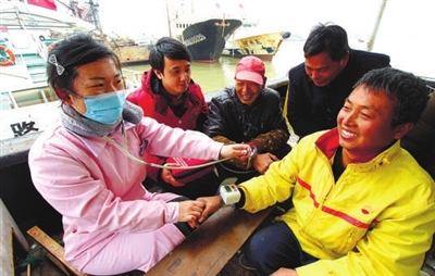 昨日,台州市路桥区金清镇组织医务人员、公安民警等党员志愿者开展“三下乡服务上渔船”活动,党员志愿者上渔船为渔民健康检查,宣传平安常识,并送去大红灯笼、春联和“福”字。通讯员蒋友青 摄