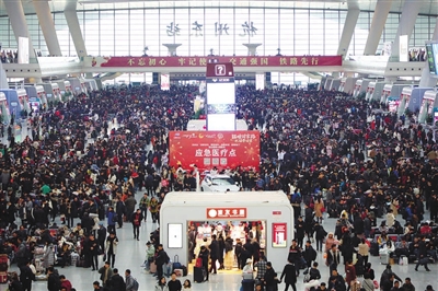 春运首日,从杭州火车东站候车大厅高处一眼望去,满满的都是候车的旅客,又是一年春运大幕拉开。