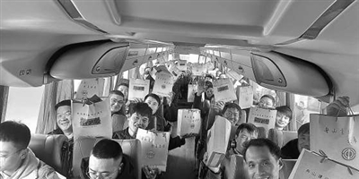 | 返乡建设者在免费接送班车上,喜悦地拿着舟山市总工会送的新年礼包。 |
