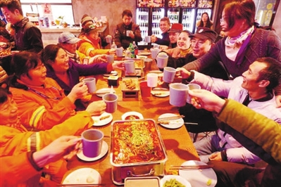 “谢谢工会,新年快乐,干杯!”近日,杭州市西湖区翠苑街道黄姑山社区联合工会举办“新杭州人同吃年夜饭”活动,街道总工会主席郑兴建和黄姑山社区工会工作人员,与30多名外来务工人员欢聚一堂,同吃年夜饭,举杯共贺新春佳节。
