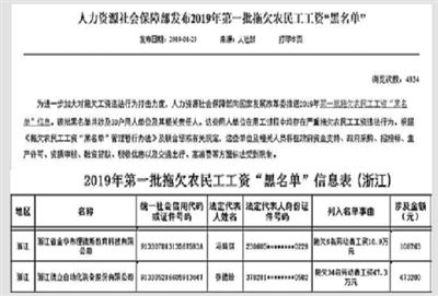 近日,人力资源社会保障部公布了2019年第一批拖欠农民工工资“黑名单”信息。该批黑名单共涉及30户用人单位及其相关责任人,其中有两家浙江的用人单位,分别是金华市理德斯教育科技有限公司、浙江德立自动化装备股份有限公司。