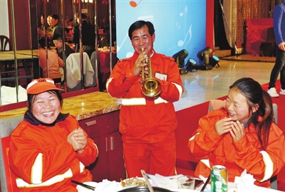 近日,杭州市江干区城管局、江干区城市环境协会、建设银行杭州秋涛支行、张生记大酒店等,为今年春节留守工作岗位的环卫工人、市政员工、停车收费员等举办欢乐年夜饭。来自安徽农村的江干环卫工人张丙林兴奋地吹起了小号,工友们纷纷为他鼓掌,迎春的笑容洋溢在每一个人的脸上。