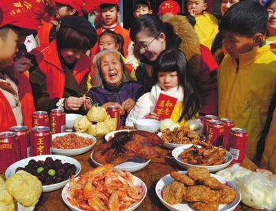 图为孩子们与孤寡老人共进“特殊年夜饭”。