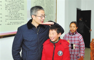 春节期间,浙建集团党委副书记、工会主席陈光锋一行,专程来到结对村——建德市西南部的航头镇大店口村走亲,向村里的10户困难家庭、10位困难学子送去慰问金和新春祝福,并资助村里修缮村民文化礼堂。图为陈光锋见到学生王哲亲热地比划起个子来。