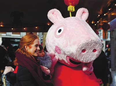2月9日,在英国伦敦,一名装扮成“小猪佩奇”的演员与小朋友合影。 当日,伦敦约克公爵广场举行以“小猪佩奇”为主题的中国农历春节庆祝活动。