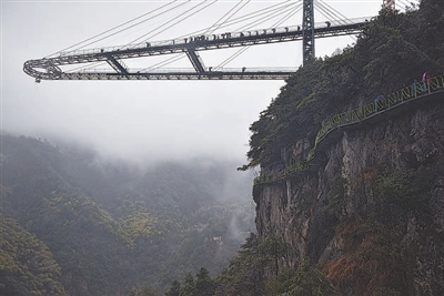 世界第一高空玻璃悬廊建成并投入运营,使得磐安这个春节旅游异常火爆。据了解,此高空玻璃悬廊全长158米,悬崖外118米,垂直高度288米,呈U型设计,一边连接山体,另一边完全悬空,给游客带去从未有过的刺激。此高空玻璃悬廊即将申报吉尼斯世界纪录。