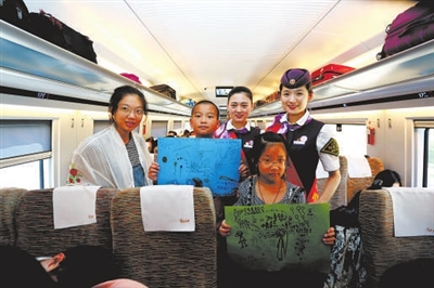 | 刁倩茹(后右一)与小旅客在一起(资料照片)。陈慈林 摄 |