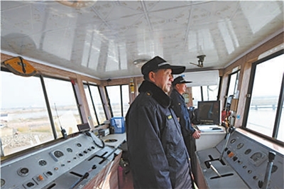 | 李宝龙在船舱驾驶室瞭望,确保船只安全航行。 |