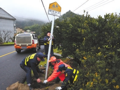 日前,常山县公路管理局芳村公路站的路政、养护人员巡查发现,有个校车接送点指示牌被过往车辆撞倒在路肩上。他们赶紧下车带上工具,齐心协力把重400多斤底部连着水泥的指示牌一点一点移到原位扶正,消除安全隐患。