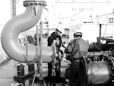 图为陶有国、丁诗严师徒正在“雷尔马”油轮上认真接装输油臂。通讯员应红枫 摄
