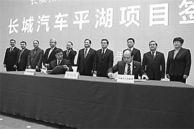 2月23日上午,长城控股集团与平湖市政府签约,计划在国家级平湖经济技术开发区建设基地型项目。项目由整车项目、长三角研发中心和长城出行三部分组成,总投资110亿元,占地面积1200亩。其中,整车项目计划于2021年投产运营,最大产能可达18万辆。预计正式投产后3年内,年销售额将超100亿元。