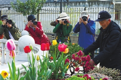 近日一大早,在德清县洛舍镇砂村村王家埭13号,82岁的王洪才又像往常一样,在300多平方米的气派庭院里精心“伺候”花卉。庭院内,兰花、牡丹以及郁金香等100多盆鲜花和盆景,吸引了德清县摄影家协会众多摄影师前来拍摄。