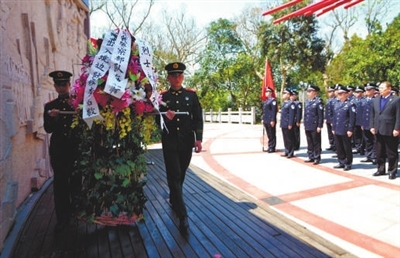| 海警官兵向革命先烈敬献花篮。 |