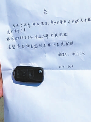 | ▲热心男子写的纸条和留下的车钥匙。 |