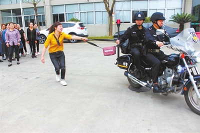 针对女性易遭抢夺的情况,昨日上午,台州市公安局椒江分局巡特警大队民警来到辖区一家企业,向女员工讲解防范飞车抢夺安全知识,并现场演示歹徒飞车抢包的作案过程,提高她们的安全防范意识。