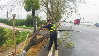 近日,大风强阵雨天气使龙游县出现多处树木侧翻、广告牌倒伏现象,阻断交通,影响市民出行。龙游公路部门加大辖区巡查力度,对倒伏的行道树扶正,对断裂的行道树吊装和清运,并出动车辆清扫路面残枝落叶,及时有效恢复公路畅通,保障市民出行安全。