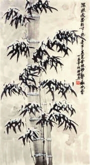 家住诸暨农村,一所三面是竹林的陋室,给他的并不只是清苦、贫寒。满目的翠竹都是他忠实的模特。有空就去画它们,天长日久,他胸有成竹。一下笔,竹子栩栩如生。从竹梢、竹叶、竹节、竹竿一直画到竹根,画过竹的风霜雨雾,画尽了竹的春夏秋冬。仿佛他自己也成了一竿高风亮节的竹。
