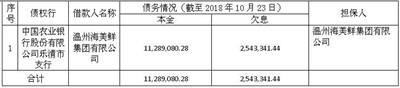 | 单位: 人民币元 注:1. 清单中“担保人”包括保证人、抵押人、出质人,担保人的担保范围以签署的合同等法律文件约定为准。如公告中债务人、合同编号、债权金额、担保人等信息与事实不符的,以签署的合同等法律文件约定为准。 2. 本公告清单列示截至2018年10月23日的贷款本金余额,借款人和担保人应支付给中国农业银行股份有限公司乐清市支行的利息、罚息、违约金及其它应付款按借款合同、担保合同及中国人民银行的有关规定或生效法律文书确定的方法计算,实际计算与欠息金额不一致,以实际计算为准。已经进入诉讼程序的,并已由中国农业银行股份有限公司乐清市支行垫付的应由借款人及担保人负担的诉讼费、执行费等以有关法律文书确定的金额为准。 3. 若借款人、担保人因各种原因更名、改制、歇业、吊销营业执照或丧失民事主体资格的,请相关承债主体及/或主管部门代位履行义务或履行清算责任。 |