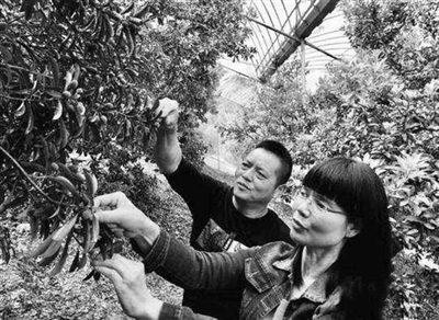 | 颜丽菊指导果农进行疏果。 刘蒸蒸 摄 |