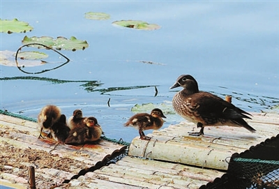 为什么要搭建爱心鸳鸯桥?水域管理处的工作人员说,是为了给景区鸳鸯一个更好的生长环境。由于西湖荷区设有拦网以防止荷花嫩芽不被鱼类啃食,但拦网高出水面一定距离,而新生鸳鸯不会飞也不会爬网,每当鸳鸯妈妈带着成群的鸳鸯宝宝进出荷区时,总会有几只鸳鸯宝宝越不过拦网和大部队脱离。工作人员表示,他们会时刻关注西湖里鸳鸯宝宝的生活动态,尽最大努力保障鸳鸯在西湖里平静地生活、幸福地成长。图为鸳鸯妈妈带着小鸳鸯在桥上休息。