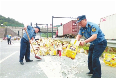 日前,在315省道江山市清湖路段,车辆行驶不慎造成了啤酒空瓶撒落路面,形成100多米长的污染带,给过往司机、行人造成安全隐患。当天,正在巡查的路政人员发现险情,立即清扫撒落的啤酒空瓶,经过近一个小时的努力,全面清扫干净,恢复交通安全。