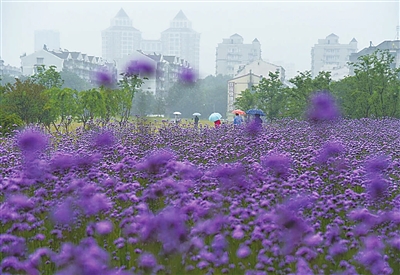 昨日,大雨,杭州城北体育公园附近,柳叶马鞭草进入盛花期,开成了一片片紫色花海,虽然下着大雨,但仍有不少市民撑伞前来花海游玩。