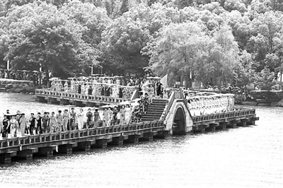 日前,由绍兴市柯桥区体育舞蹈协会主办的大型旗袍秀在瓜渚湖畔上演。由近500位市民参加的旗袍走秀队伍缓缓经过金梭桥,成为一道亮丽的风景线,充满了浓郁的江南风情。