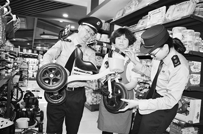 随着“六一”儿童节临近,各类儿童用品进入销售旺季。近期,湖州市南浔区市场监管局练市镇分局以各大、中型商超、校园周边店及母婴用品店为重点场所开展了儿童玩具销售市场专项检查,针对儿童玩具标签、警示标识是否齐全、是否注明厂名厂址、包装是否配有中文说明以及是否存在销售未经3C认证玩具等行为进行了重点检查。图为5月23日该局执法人员正在对一款儿童玩具车进行仔细检查。
