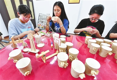 昨日,宁波市生活垃圾分类办公室联合浙江纺织服装职业技术学院启动纪念第48个世界环境日暨垃圾分类宣传周活动。有关方面将通过“垃圾分类”主题宣讲、“绿色校园”环保设计大赛等系列活动,向师生宣传生态环保理念,鼓励、引导师生践行绿色生活,参与美丽校园建设。图为学院的学生利用废旧一次性杯子制作笔筒、花瓶等工艺品。