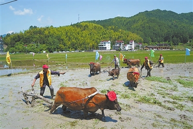 随着青田开犁节活动开犁的号令发出。10头耕牛在10名犁田能手的操纵下齐发耕田,田边10名盛装的鼓手擂鼓助威呐喊,拉开了热闹激烈的开犁节活动序幕。 杜志华 摄