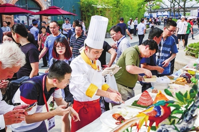 本报讯 记者张浩呈摄影报道 首届中国—中东欧国家博览会暨国际消费品博览会唯一的人文交流活动——“舌尖上的相遇—中东欧美食与‘诗画浙江·百县千碗’人文交流活动”于昨日在宁波老外滩开幕。
