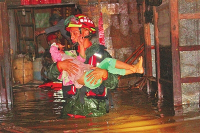端午假期期间,衢州江山等地突降暴雨,造成洪水泛滥,部分地区被淹,民房受损,大量村民被困等待救援。接警后,衢州市消防救援支队第一时间调集救援力量携带冲锋舟等装备赶赴现场参与抗洪救灾。经过消防指战员十多个小时的连续奋战,成功疏散转移被困群众91人。图为“浙江最美90后”“最美衢州人”、官庄中队二级消防士余军健主动请缨带病前往参加救援,并成功转移一名小女孩。