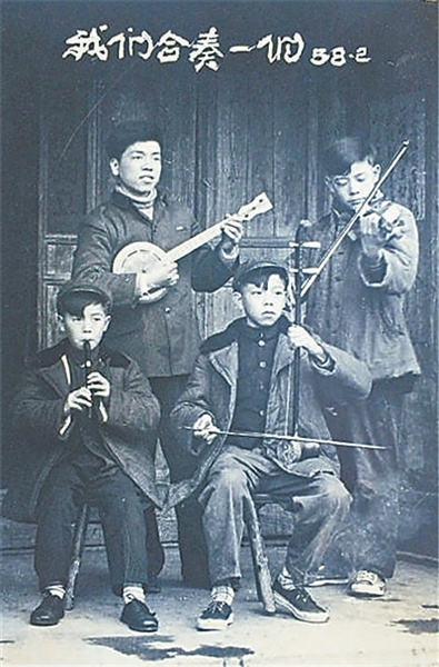 | 1958年,方杰的4位舅舅在温州鳌江老家拿着乐器合奏(资料照片)。 |