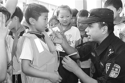 暑假临近,为防止假期学生溺水事故的发生,近日,台州市公安局椒江分局巡特警大队民警来到椒江区民工学校——东门小学,开展防溺水安全常识宣传,向小学生讲解如何防溺水、溺水时如何自救等常识,提高孩子们的自救互救能力,保障学生快乐安全过暑假。图为民警给小学生讲解溺水后的急救知识。