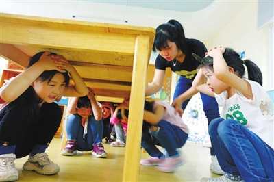 昨日,德清县中心幼儿园开展“防震减灾从娃娃抓起”的地震逃生演练活动,孩子们在老师的指导下,就近躲避桌子下、走下楼梯、远离建筑物等,以增强师生的防震减灾意识,提高幼儿的自我保护能力。