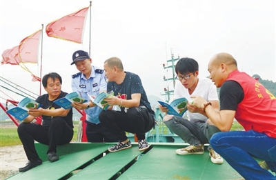 图为6月17日下午,民警正在健跳渔港码头开展禁毒宣传。