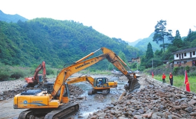 江山县道张柘线是张村乡至原双溪口乡的唯一陆路通道,连日暴雨致该条公路多处路段冲毁,交通中断。险情发生后,江山市交通公路部门调集多台机械车,组成应急抢险队,加班加点施工,抢通交通“生命线”。
