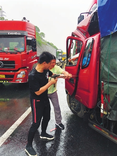 近日,台州市公安局椒江分局白云派出所民警徐雄鹰、曹蜜等人出差途经衢州往诸暨高速公路金华出口时,遇到两辆货车追尾相撞,其中一名驾驶员被卡在驾驶室,腿部无法移动。徐雄鹰、曹蜜马上从警车上找来简易救援工具,展开破拆,给驾驶员腾出了一定的空间。随后,他们与赶到的消防员一起将被困的驾驶员救了出来。