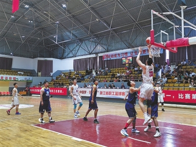 本报讯 见习记者邹伟锋 通讯员范叶华摄影报道 昨日下午,由省总工会主办,嘉兴市总工会、省篮球协会、海宁市总工会承办,长安镇(高新区)总工会执行承办的“中国梦·劳动美”全省职工篮球赛在海宁长安体育馆开幕,全省20支职工篮球队“逐鹿”古镇长安。据悉,这是省总工会首次组织全省性职工篮球比赛。