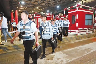 图为椒江大桥工作人员完成使命后,撤出岗位。