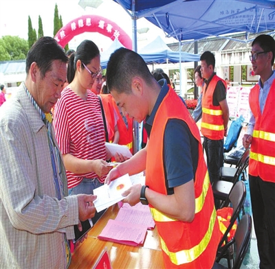 为配合“全国安全生产月宣传咨询日”活动的开展,近日,龙游交通运输局组织人员在县城人流密集的市民休闲健身广场“摆摊”,开展交通安全相关知识宣传。图为活动现场,宣传人员通过展板、发放宣传册、现场咨询等形式向群众宣传交通安全知识。