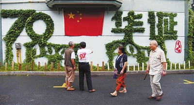 这面活藤墙艺出自该社区63岁的贺出意先生之手,他从2008年起,每年选择当年的重大事件作为主题,在自家所住居民楼的外墙下栽种藤类植物,通过精心栽培、引导生长和修剪造型,已在这面墙上先后创作出“奥运藤”“世博藤”“G20峰会藤”等作品。别具创意和寓意,早已使这面藤艺墙成为社区里一道远近闻名的“网红墙”。今年他创作的作品由“70”“华诞”等字样组成,中间窗户位置挂上一面鲜艳的国旗,简洁明了地表达了“祝福新中国70华诞”的美好寓意。