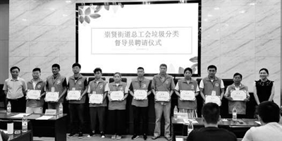 “生活垃圾除了湿垃圾、有害垃圾、干垃圾外,还有什么?”近日,杭州市余杭区崇贤街道总工会组织百余名职工开展垃圾分类知识竞赛大比武,并聘请24名街道工会志愿者为街道垃圾分类督导员,进一步增强企业职工垃圾分类意识,提升职工垃圾分类水平。图为督导员聘请仪式。见习记者邹伟锋 摄