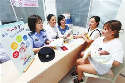 近日,在台州市路桥区恩泽医院产科服务点,警务工作人员等正在为群众提供办理“出生一件事”服务。