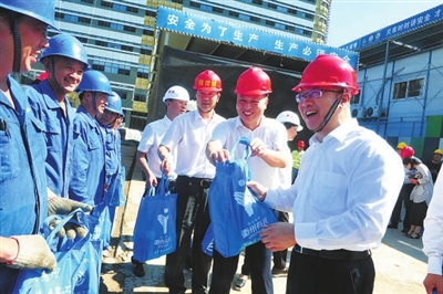 图为衢州市委书记徐文光(右一)在市妇保院工程项目工地送清凉。毛朝阳 摄