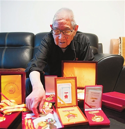| 胡兆富在家中展示自己所获的军功章(7月15日摄)。 新华社记者翁忻旸 摄 |