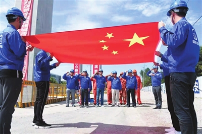 本报讯 记者胡翀 通讯员高扬报道 “我在绍兴越东路现场宣誓:我是祖国的护旗手!祖国在我心中,五星红旗红遍祖国大地,我护卫五星红旗升起!祖国我爱您!”昨日,绍兴智慧快速路项目越东智慧快速路1标施工现场举行了一场简单而庄重的守护国旗活动。22名一线施工技术人员在庄严的国歌声中,举拳宣誓——不忘初心、牢记使命,努力工作、建设祖国!