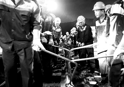23:30,最后一趟列车通过,道口进入天窗维修点,整装待发的工务职工以决胜之势迅速展开行动,场面浩大却又井然有序。整个道口翻修分为起枕木、挖填道碴、铺枕木、盖道口板等工序。数百斤的枕木、数千斤的道口板、数吨的钢轨……每一块设备都需要“满格”的干劲、每一道工序都需要高度的注意力和强劲的团队凝聚力。